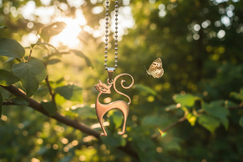 Sitzende Ägyptische Katze mit einer Kette, Silber oder Goldfarben -